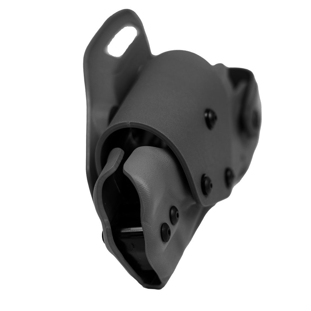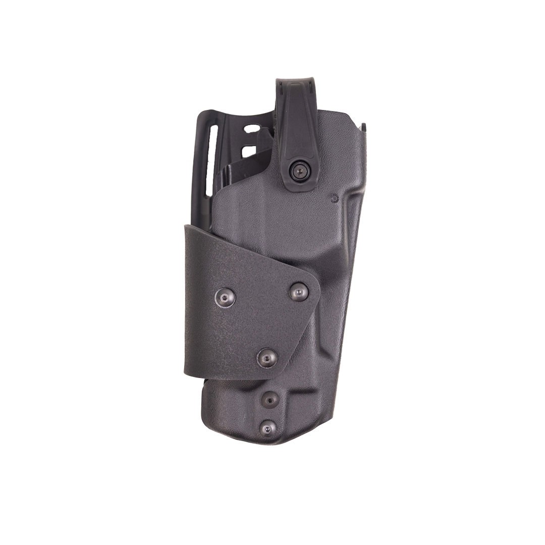 Voici un étui de transport en KYDEX avec une rétention de niveau 3 pour un pistolet GLOCK 17 équipé d’un système d’aide à la visée avec une lampe tactique. L’holster est fourni avec 2 enveloppes afin de pouvoir utiliser une grande partie des lampes tactiques existantes sur le marché. Il est pourvu de 3 rétentions et il est fourni avec un déport bas S-Closer 3×120° pour une installation sur la ceinture. La 1ʳᵉ rétention (Système STR) permet le maintien de l’arme dans l’étui par un jeu de serrage de 2 vis qui règle la force de rétention selon la volonté de l’opérateur. La 2° rétention est.