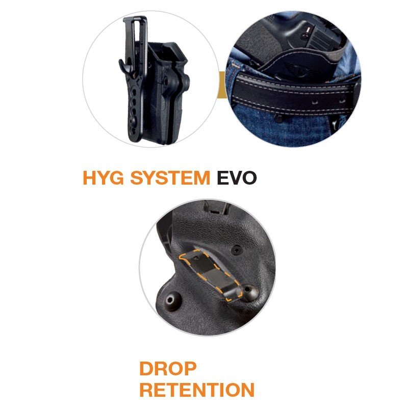 Holster SITS STEADY en Kydex et recouvert en daim microfibre antidérapant pour le pistolet Glock® 17/19. Il permet un port de l’arme de façon discrète avec une rétention de niveau 1. Il se porte à l’intérieur du pantalon et vient se bloquer à la ceinture grâce à la fixation HYG SYSTEM EVO dotée de sa languette qui se crochète sous la ceinture afin de maintenir l’étui lors du dégainé.