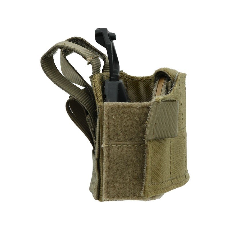 Se fixe avec 2 languette souples de type MOLLE sur tout équipement pourvu de passants MOLLE (Plaque de cuisse souple, ceinturon tactique, Housse pare-balles, etc…)