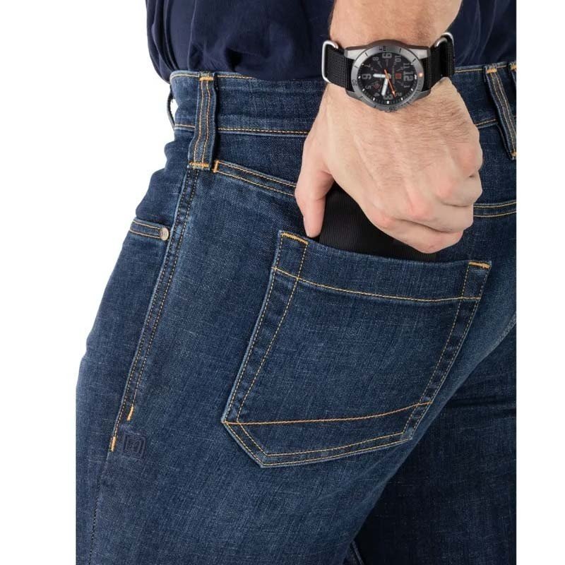 Le Jean Defender-Flex Slim de 5.11 Tactical répond aux demandes des opérateurs et des professionnels actifs pour un jean combinant style quotidien, robustesse tactique et flexibilité optimale. Sa coupe slim moderne et ses 5 poches classiques lui confèrent l’apparence d’un jean ordinaire, dissimulant habilement ses 2 poches discrètes pour chargeurs AR. Ce jean extensible en denim élastique (76 % coton, 24 % polyester avec Lycra® T400 Tough Max™) convient aussi bien aux missions en civil qu’aux activités du quotidien, au champ de tir comme au dîner entre amis. Coloris : Dark Wash Indigo, taille 34/32.