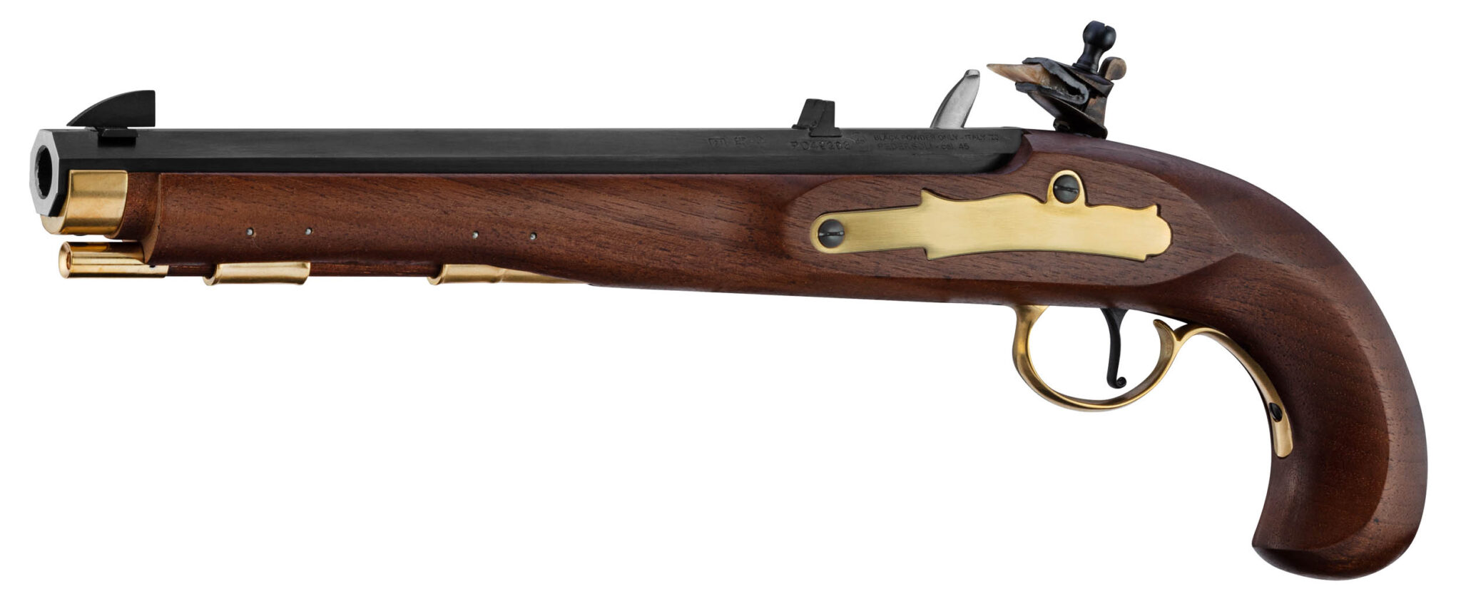 Le Pistolet Kentucky à silex de Davide PEDERSOLI & C s’impose comme un choix de référence dans l’univers armes de poing historiques. Canon à 12 rayures au pas de 1:18 » soit 450 mm. Ce produit se distingue notamment par ses performances, disponible en calibre [‘.54 PN’, ‘.45 PN’, ‘.50 PN’].