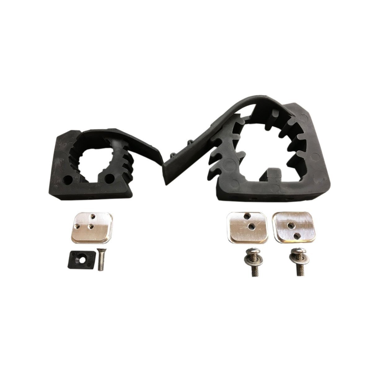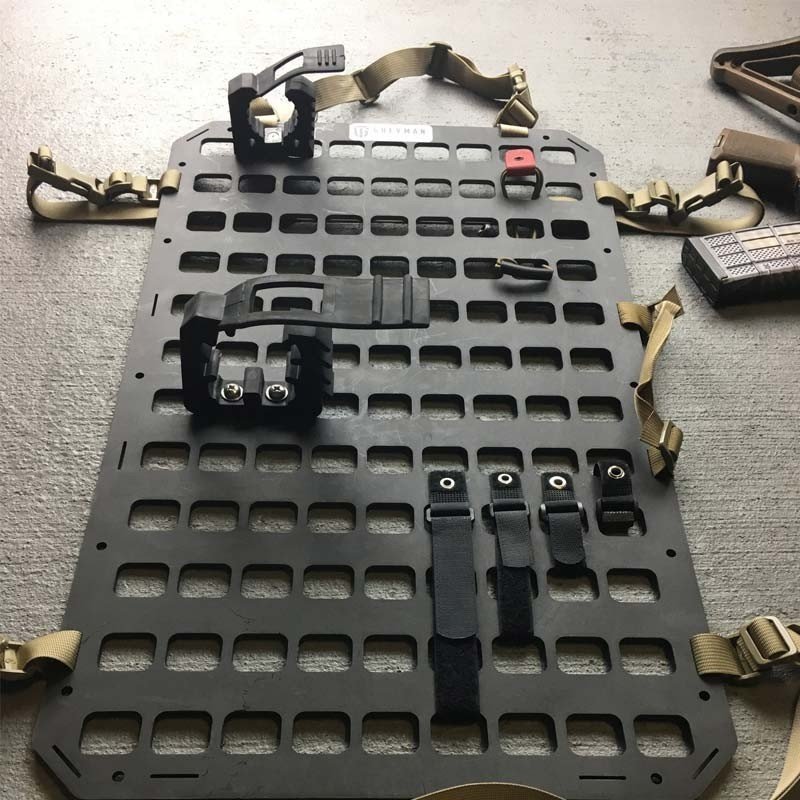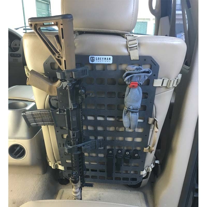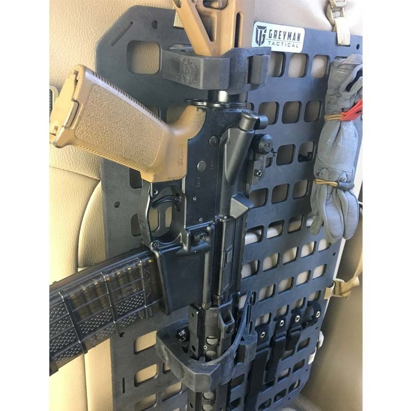 Système de porte-fusils pour véhicule utilisant 2 colliers en caoutchouc très résistants, spécifiquement conçu pour être utilisé avec toutes les tailles de panneaux MOLLE RIP-M Grey Man Tactical. Le kit comprend des plaques de renfort en aluminium pe