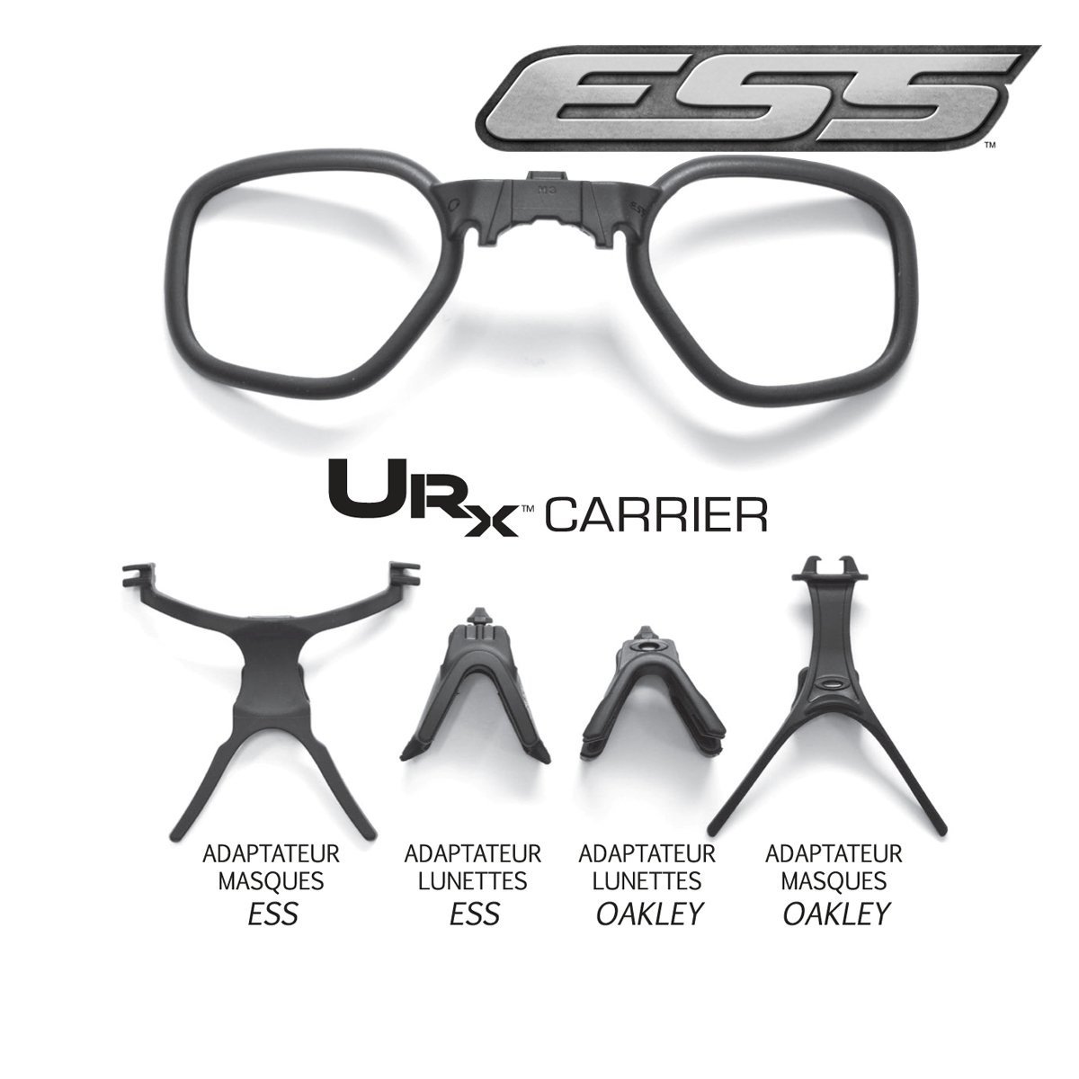 La monture en nylon pour verres correcteurs U-Rx a été développée pour être la solution la plus complète et la plus modulaire. Compatible entre différentes marques puisqu’elle est interchangeable sur une grande variété de lunettes et masques balistique ESS et Oakley. Elle comporte deux jeux de pièces nasales pour lunettes et d’adaptateurs pour masques pour les produits des marques ESS et Oakley. Ils se fixent simplement sur vos lunettes ou masques, il suffit ensuite de les confier à votre opticien.