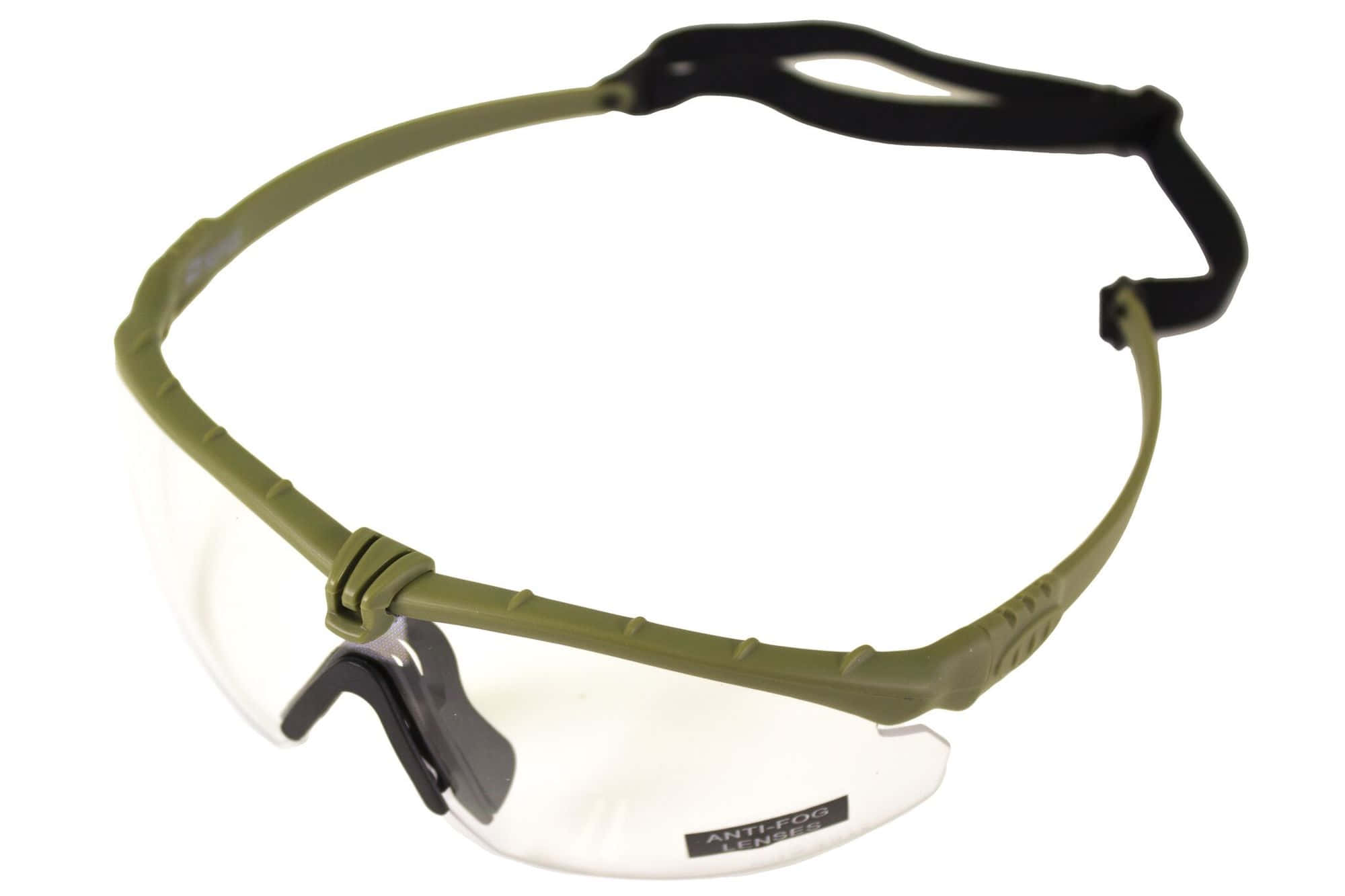 Traitement anti-buéeTraitement anti-rayureFournies avec un élastique pour régler les lunettes à sa tailleDesign plus travaillé, monture couleur verte et écran transparent/clearProtection UV400Conformes à la directive EN166Livrées avec un étui en tissu