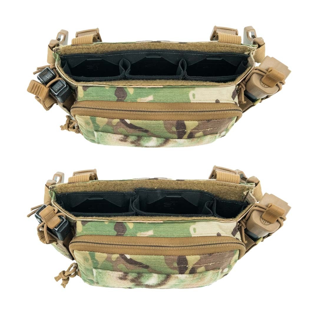 Lorsqu’il est porté sur un porte-plaques dotée d’un système de fixation rapide, l’équipement de poitrine peut être attaché ou rangé en quelques secondes. Cela donne à l’utilisateur final la possibilité de passer d’une tenue discrète à une tenue haute visibilité ou vice versa. Le Micro possède 2 poches utilitaires latérales avec des élastiques pour le transport rationalisé de chargeurs de pistolet, de lampes de poche, d’outils utilitaires ou de grenades de 37 mm/40 mm.
