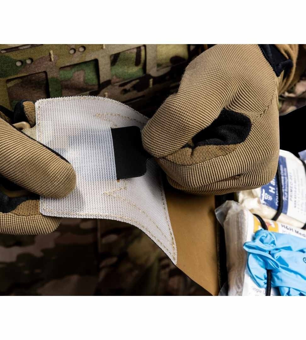 Disponible en coloris tactique, ce Frogpro se porte dans la zone lombaire de la ceinture de combat pour un accès optimal. L’anneau en D ITW Nexus® permet une extraction instantanée de l’insert médical, qui se déplie pour révéler son contenu en cas d’urgence.