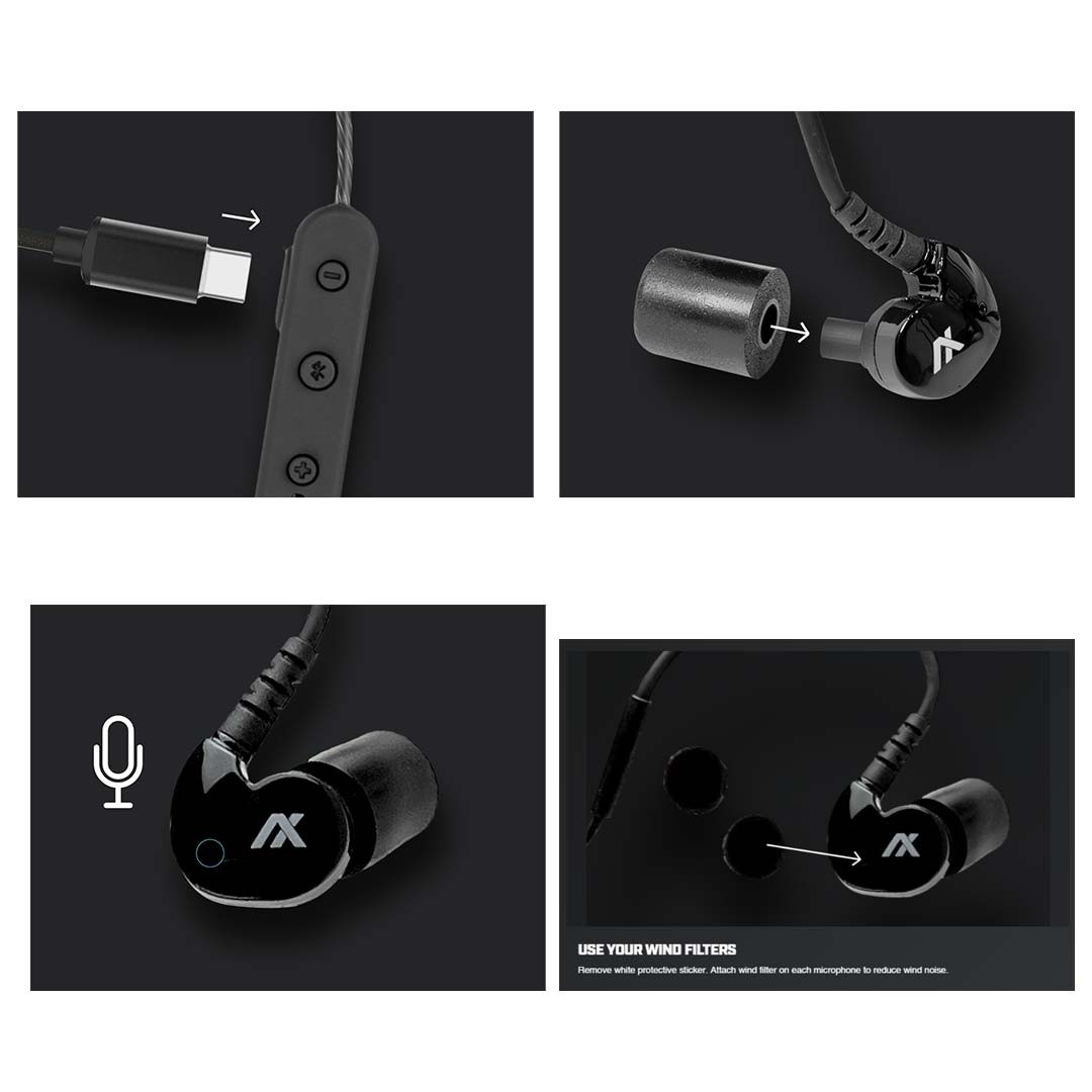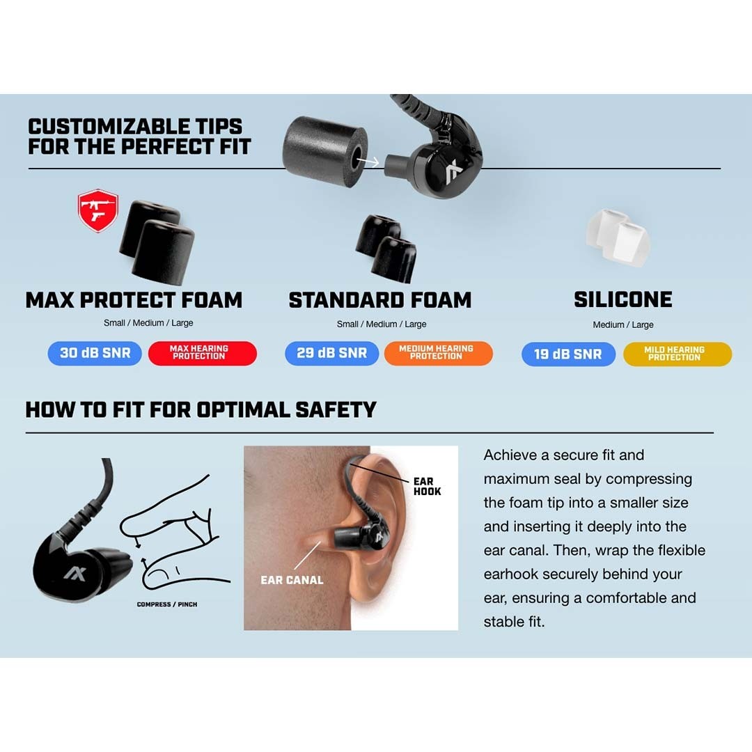 | Description fabricant | Les GS Extreme 2.0 offre une utilisation 3 en 1, c’est comme si vous aviez des écouteurs Bluetooth, des écouteurs à isolation phoniques et des protections auditives électroniques en un seul produit. Ils sont livrés avec 8 paires d’embouts pour la plupart des utilisations, dont des mousses Max Protect Foam. Crochets d’oreille SportFit pour rester confortablement dans l’oreille Batterie lithium rechargeable sur cordon Jusqu’à 25 heures d’autonomie pour l’amélioration et la protection de l’audition Jusqu’à 120 heures d’autonomie en veille Bâtons de contrôle pour le Bluetooth et le volume de l’audition et de la protection Caractéristiques Protection SNR (norme U.E) : Embout en mousse 29 dB / Embout en silicone 19 dB (la mousse offre plus d’efficacité) Amélioration du son et protection auditive Audio Bluetooth 5.0 pour un son de qualité studio et une communication mains libres Compression des sons forts à 85 dB ou plus Haut-parleur dynamique 6.5 Premium Spectre sonore de 0 HZ à 40 000 HZ 25 heures d’autonomie pour l’amélioration de l’audition 9 heures Durée d’utilisation audio 8 heures d’autonomie combinée entre l’amélioration de l’audition et l’audio Résistant à l’eau et à la sueur Son Bluetooth® par AKG Certifications : CE 2834 / EN352 Coloris : Noir Dans la boite Paire GS Extreme 2.0 Étui rigide zippé 8 paires d’embouts auriculaires en silicone ou en mousse 2 Filtres anti-vent Câble de charge USB-C Clip de fixation Notice * Les photos secondaires avec d’autres coloris sont non contractuelles |