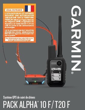 Pack Garmin Alpha 10 + T20 Version F. Suivi GPS jusqu'à 20 chiens, portée 9 km, T20 40h autonomie. Solution complète pour chasseurs. Homologué France.