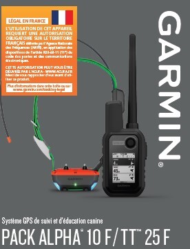 Pack Garmin Alpha 10 + TT25 Version F. Suivi GPS + dressage, 9 km portée, TT25 40h autonomie, 10 niveaux stimulation. Système complet pour chasse canin.