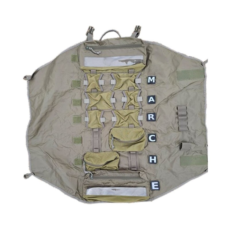 1 velcro d’identification Les dispositifs de protection sont : Double épaisseur matière en nylon RIP STOP 100 deniers 2 rabats (champ) de protection contre le sable et la poussière de 85 cm x 32 cm. 4 pontets d’immobilisation des champs. Un dispositif d’identification rétro réfléchissant par velcro M.A.R.C.H.E repositionnable Caractéristiques techniques Poids : 480 g Dimensions : 85 cm x 90 cm (déployé) •Déploiement : < 5 s Garanties : Garantie 24 mois contre tout vice de fabrication. Couleurs : Colorimétrie de la toile : Olive (noir et Coyote sur commande)