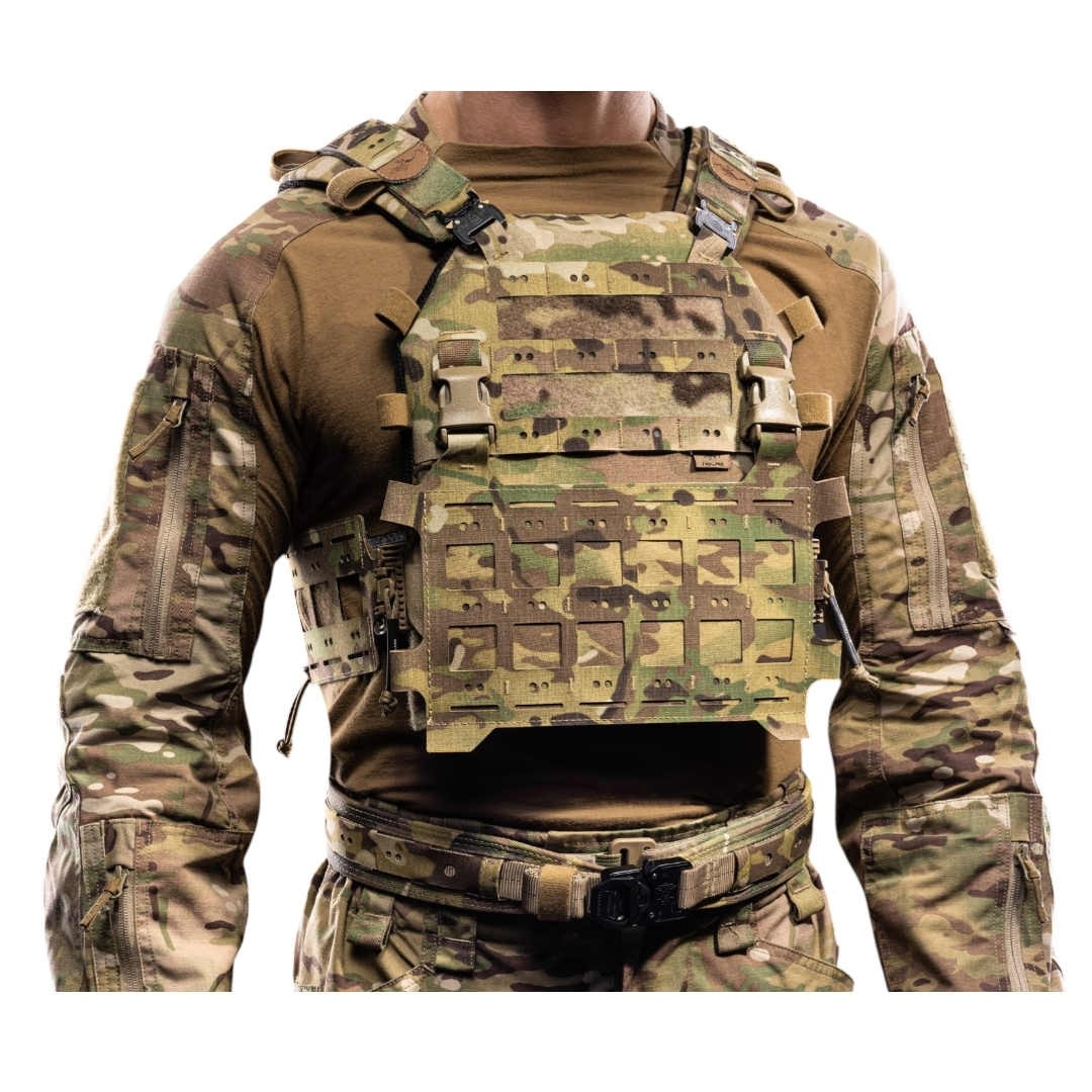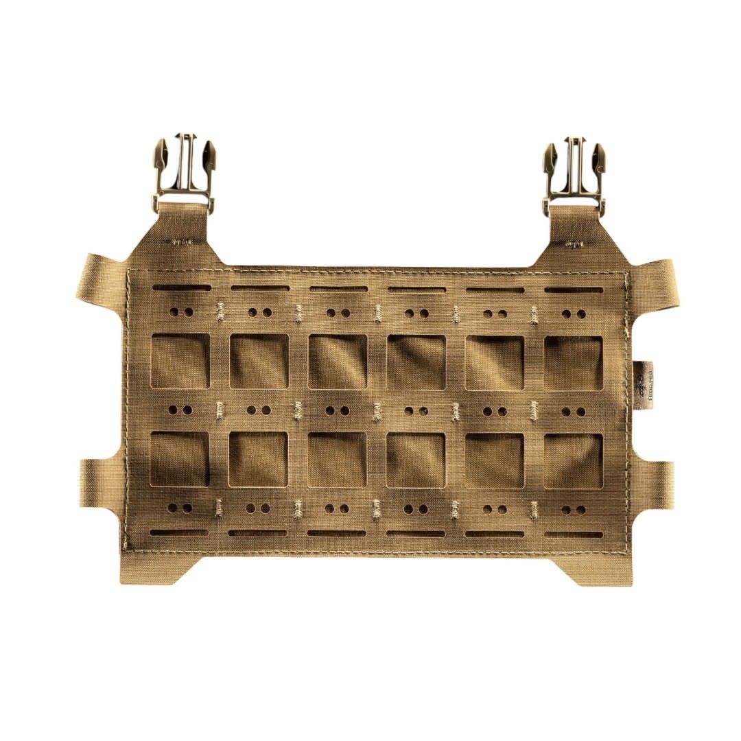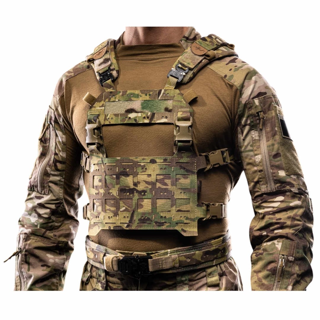 Construction en tissu composite LAHYCO découpé au laser . Compatibilité avec toutes les poches MOLLE PALS standard. Possibilité de fixation directe d’accessoires avec shock cord. Tissu NIR-compliant réduisant la signature sous NVG. Matériau hydrophobe adapté aux environnements humides et maritimes. Configuration possible en panneau frontal ou chest rig modulaire . Structure légère limitant l’encombrement et le poids de l’équipement. Carac