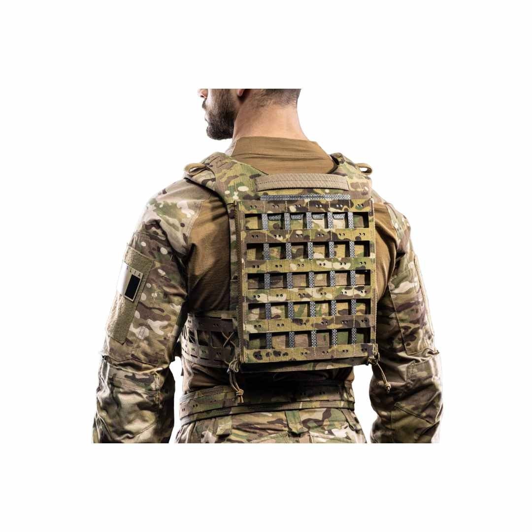 Le Molle Back Panel est un panneau dorsal MOLLE modulaire conçu pour offrir une liberté maximale dans la configuration de l’équipement tout en conservant un poids réduit grâce à sa conception ajourée. Il constitue une solution idéale pour optimiser la capacité d’emport à l’arrière d’un porte-plaques . Sa structure en technopolymère Tegris® , associée au tissu composite LAHYCO , garantit rigidité, légèreté et durabilité. Le système Multi-Dot MOLLE PALS FROG.PRO permet la fixation de poches ainsi que le passage de cordons élastiques pour organiser efficacement les câbles radio ou les antennes. Le tissu LAHYCO est NIR-compliant , hydrophobe et résistant à la flamme , réduisant la signature sous vision nocturne, améliorant la mobilité en environnement humide ou maritime et renforçant la protection de l’utilisateur en cas d’exposition à la chaleur. Le design du panneau permet la fixation de poches MOLLE à la fois sur la face externe et sur la face interne. Cette dernière est recouverte de Velcro® velours , permettant l’utilisation d’inserts Velcro. Cette configuration offre des possibilités avancées, comme le port de chargeurs en position inversée ou l’intégration d’une poche d’hydratation compacte protégée entre le panneau et le porte-plaques. L’installation est rapide et sécurisée grâce au système innovant V.LOK Fork Locking Interface en Tegris®, qui permet de fixer le panneau directement sur le système MOLLE sans matériel supplémentaire.