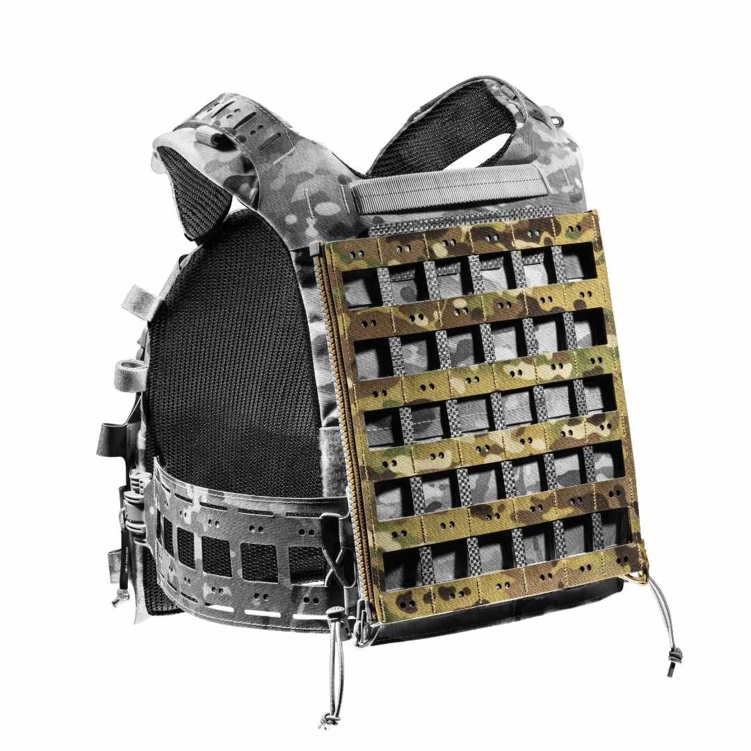 Des fermetures YKK® latérales renforcent la stabilité et assurent le maintien de la charge. Points forts Panneau dorsal MOLLE modulaire et léger. Structure en technopolymère Tegris® ajourée. Tissu LAHYCO avec système Multi-Dot MOLLE PALS. Fixation de poches sur faces externe et interne. Surface interne compatible inserts Velcro®. Système V.LOK pour installation rapide sans outils. Gestion des câbles radio et antennes facilitée. Résistance NIR, hydrophobe et ignifuge. Caractéristiques principales Panneau dorsal MOLLE pour porte-plaques