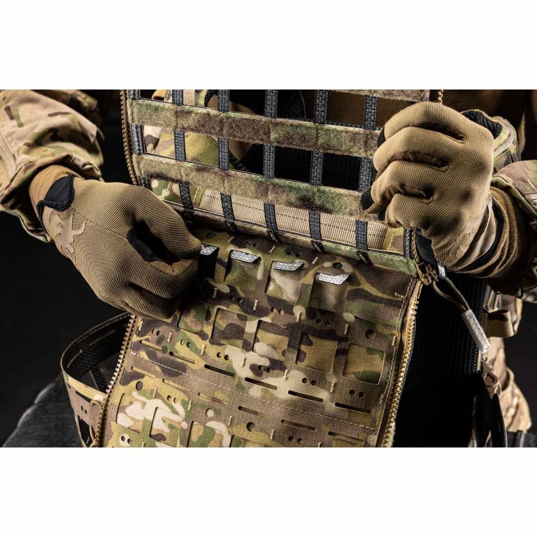 Le Molle Back Panel est un panneau dorsal MOLLE modulaire conçu pour offrir une liberté maximale dans la configuration de l’équipement tout en conservant un poids réduit grâce à sa conception ajourée. Il constitue une solution idéale pour optimiser la capacité d’emport à l’arrière d’un porte-plaques . Sa structure en technopolymère Tegris® , associée au tissu composite LAHYCO , garantit rigidité, légèreté et durabilité. Le système Multi-Dot MOLLE PALS FROG.PRO permet la fixation de poches ainsi que le passage de cordons élastiques pour organiser efficacement les câbles radio ou les antennes. Le tissu LAHYCO est NIR-compliant , hydrophobe et résistant à la flamme , réduisant la signature sous vision nocturne, améliorant la mobilité en environnement humide ou maritime et renforçant la protection de l’utilisateur en cas d’exposition à la chaleur. Le design du panneau permet la fixation de poches MOLLE à la fois sur la face externe et sur la face interne. Cette dernière est recouverte de Velcro® velours , permettant l’utilisation d’inserts Velcro. Cette configuration offre des possibilités avancées, comme le port de chargeurs en position inversée ou l’intégration d’une poche d’hydratation compacte protégée entre le panneau et le porte-plaques. L’installation est rapide et sécurisée grâce au système innovant V.LOK Fork Locking Interface en Tegris®, qui permet de fixer le panneau directement sur le système MOLLE sans matériel supplémentaire.