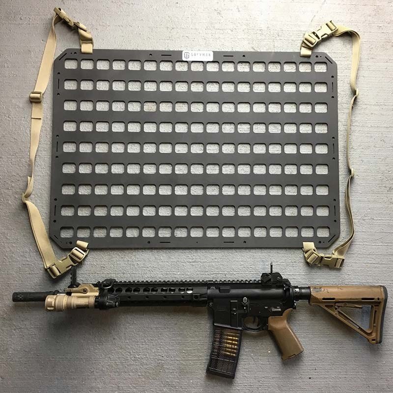 Le RIP-M 69 x 48 cm seul, est un panneau MOLLE personnalisable qui peut être inséré dans un grand sac, un coffre d’armes, un véhicule etc… Il est suffisamment rigide pour ne pas se déformer et fourni un accès rapide et organisé à votre équipement. Il permet d’équiper ou de déséquiper votre équipement d’un bloc en sortant ou en glissant le RIP-M de son emplacement. Fixez-le à l’aide des accessoires de fixation Grey Man qui sont disponibles séparément.