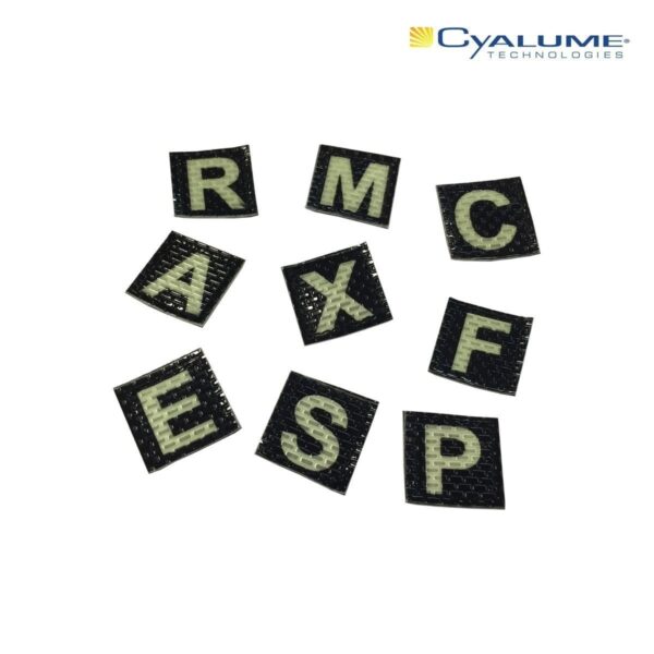 Un patch photoluminescent Cyalume est un insigne Velcro® sur fond noir dont le motif jaune absorbe la lumière ambiante (naturelle ou artificielle) et la restitue dans l’obscurité. Il permet une identification visuelle sans recours à une source lumineuse active.