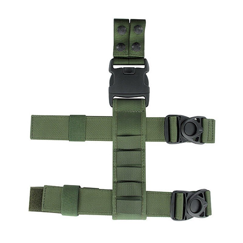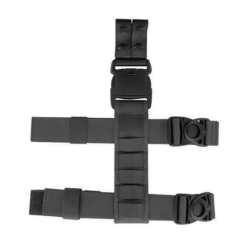 Plate-forme de cuisse permettant de transporter des holsters et des accessoires. Elle possède une sangle de ceinture avec fixation par double bouton-pression, munie d’une boucle de sécurité à 3 points et d’une sangle Molle à l’avant. Les 2 sangles de jambe sont réglables avec des boucles pivotantes à attache rapide.
