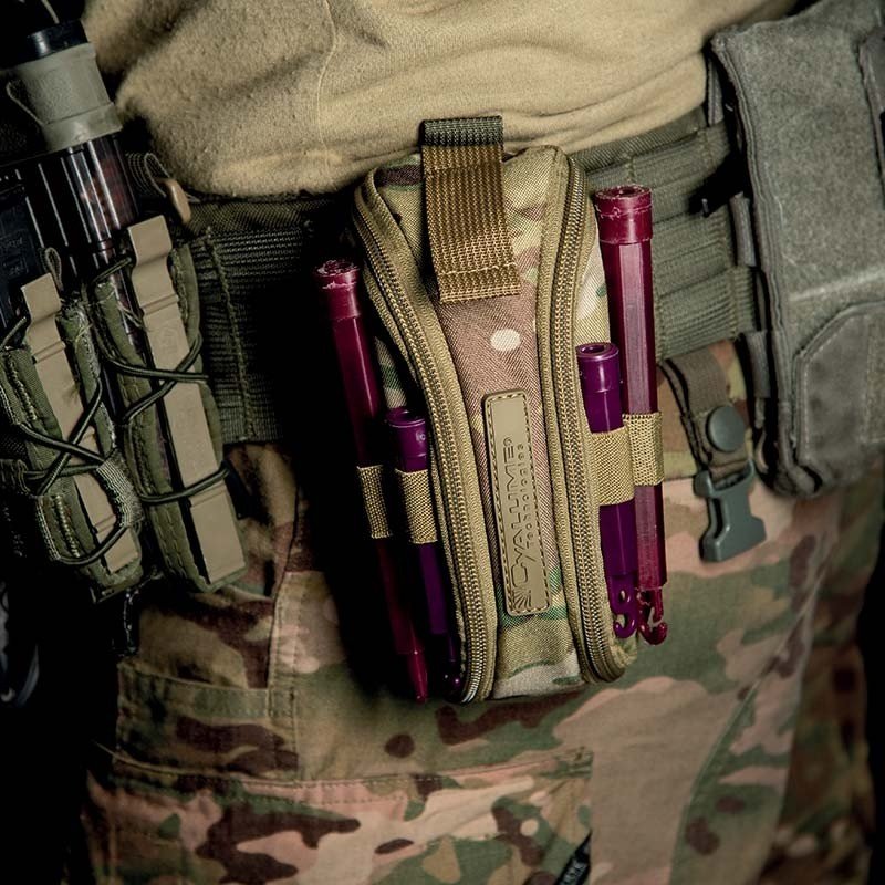 Le porte-cyalume CyPouch a été conçu pour le transport des bâtons lumineux cyalume de 10 et 15 cm afin de préserver leur performance (protection de la lumière). La pochette en Cordura® possède des passants élastiques et des anneaux métalliques pour permettre le port des Cyalumes en grappe ou en étui. Elle se fixe sur des passants MOLLE et elle est étudiée pour permettre la saisie avec une seule main lors de phases délicates.
