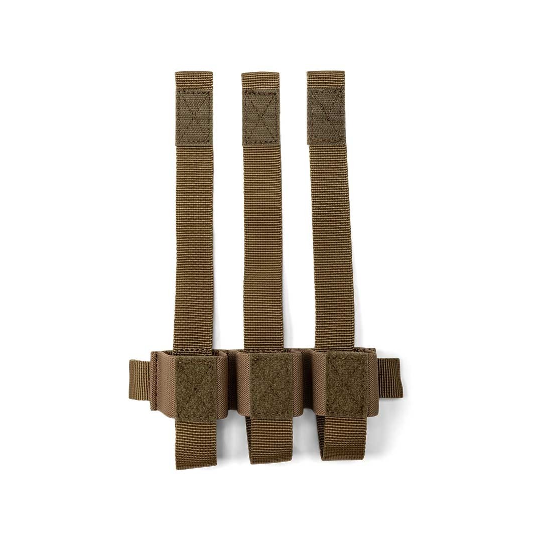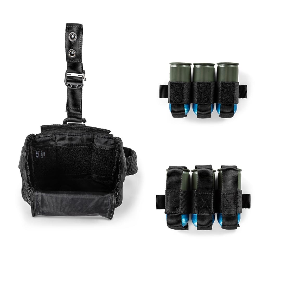 La pochette de 6 grenades s’ouvre et se ferme d’une seule main et elle permet d’empiler les cartouches en position haute ou basse pour accéder aux différents types de grenades. Elle comprend 2 bandoulières amovibles auto-agrippantes de 3 cartouches et des sangles de rétention amovibles.