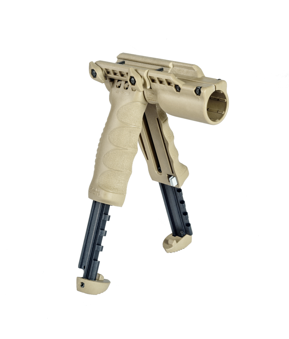 Pour le tir de précision à longue distance, un bipied dédié de haute qualité (Atlas, Harris) sera supérieur. Cette poignée-bipied est adaptée au tir de milieu de gamme et aux configurations polyvalentes 3-gun.