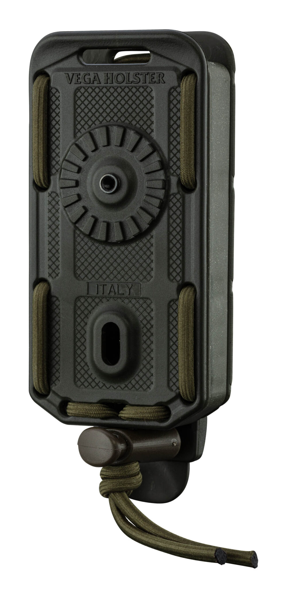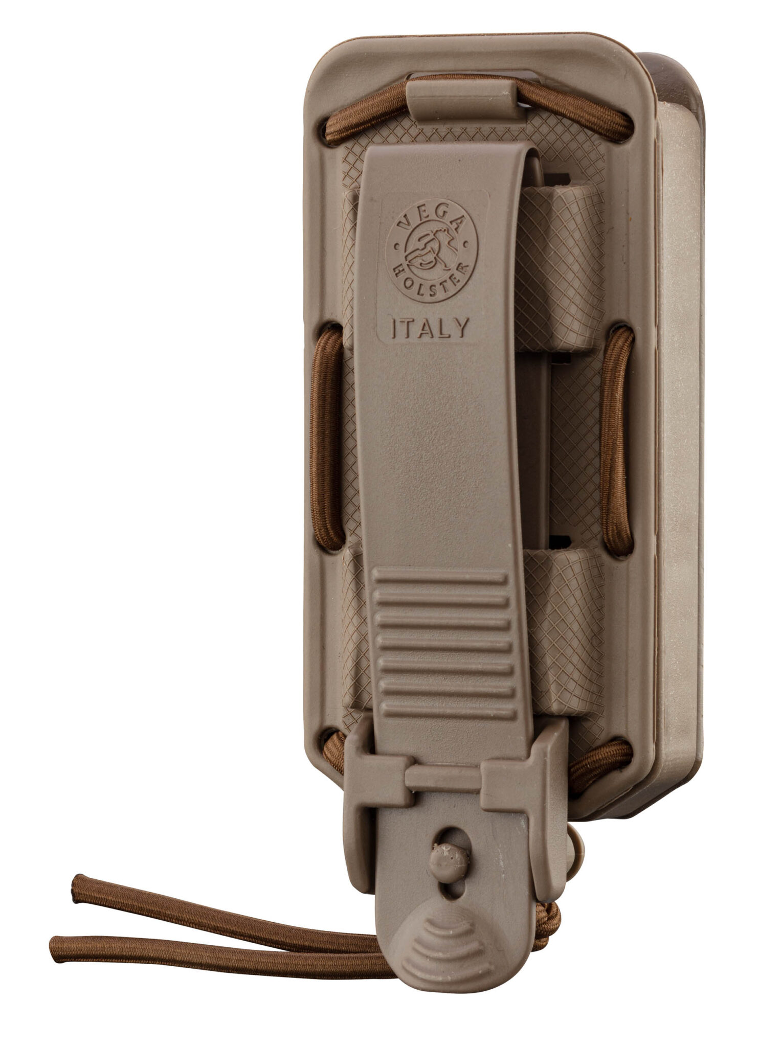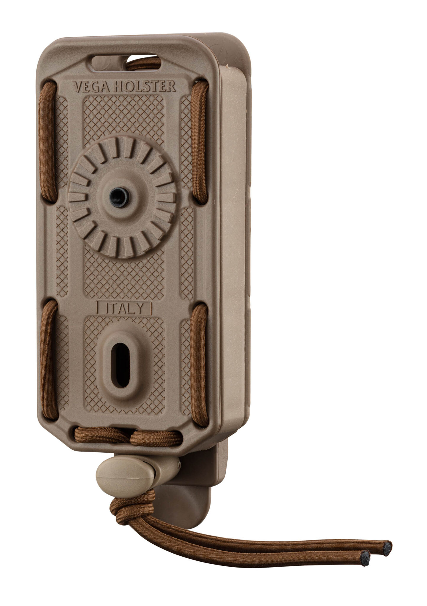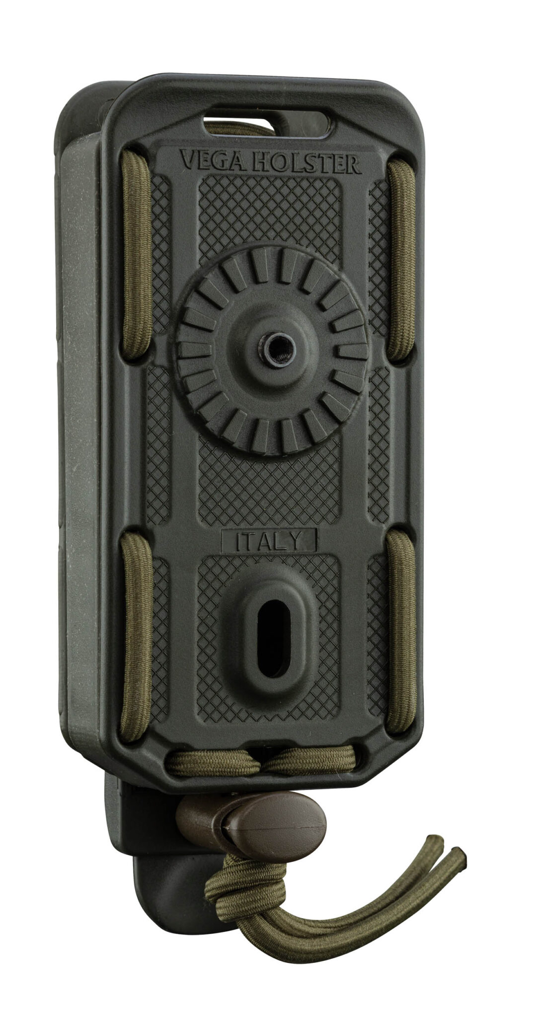 Usiné en polymère injecté avec revêtement en caoutchouc Compatible avec tous les modèles de chargeur de pistolet à double pile Système ajustable avec ses liens élastiques Système de fixation MOLLE Pré-équipé sur sa face avant pour le montage d'une platine rotative
