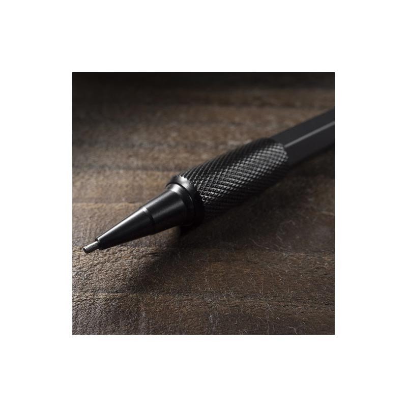 Conçu pour résister aux journées de travail les plus difficiles, ce crayon est doté d’une large poignée moletée facile à manipuler, même avec des gants. La mine noire de 1,3 mm ne se casse pas à la pointe. Avancement de la mine par clic d’une main. Grip, plume et mécanisme en laiton.