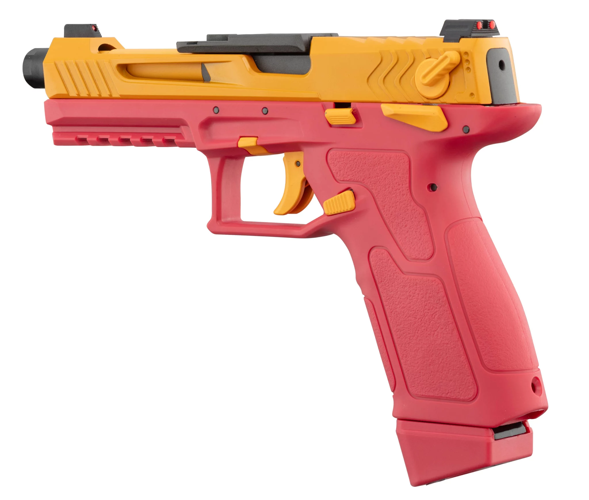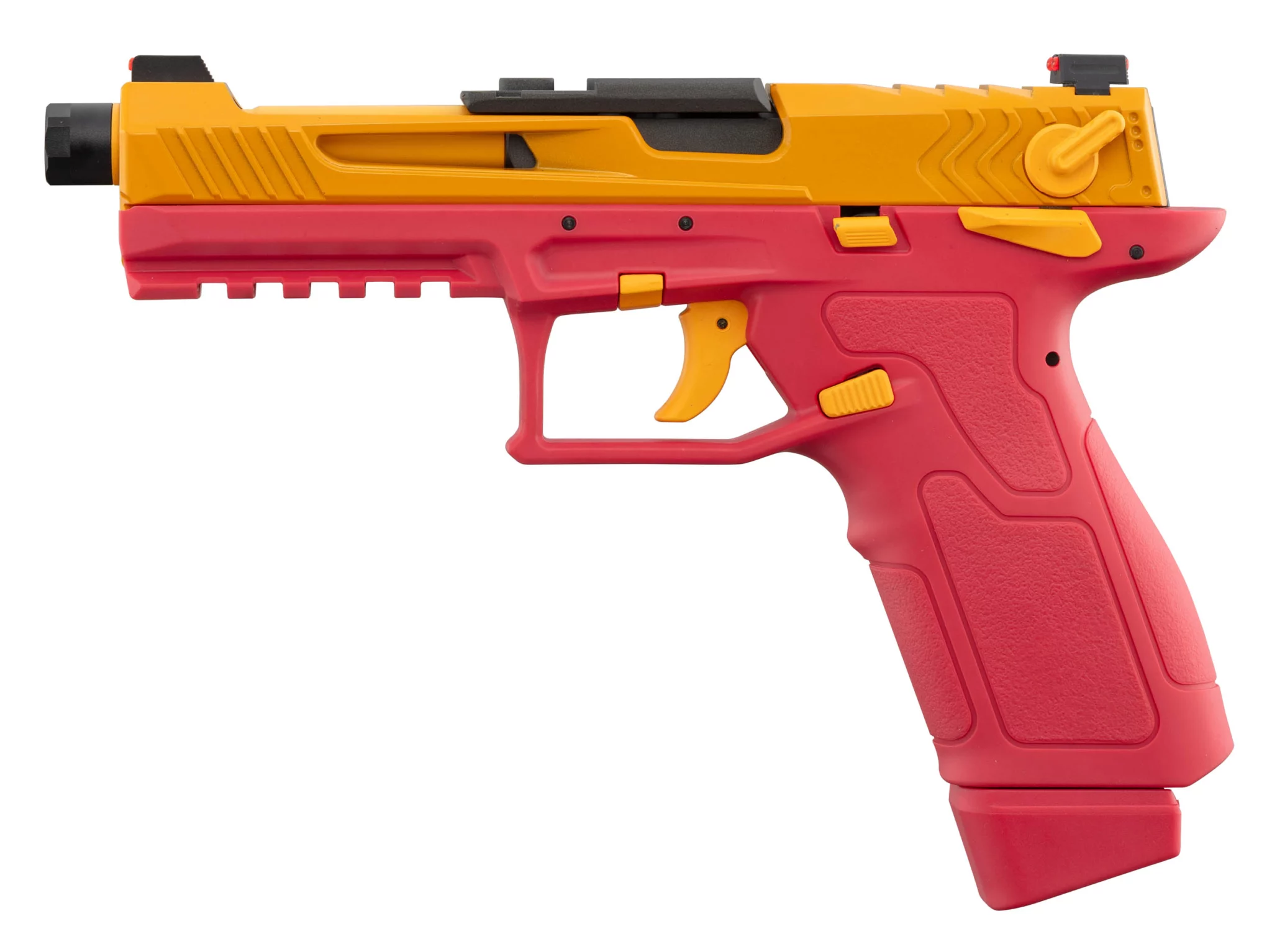 Pistolet airsoft à gaz GBB coloris Rouge et Or. Blow back réaliste, finition bicolore rare. Collection ou terrain, un choix à personnalité.