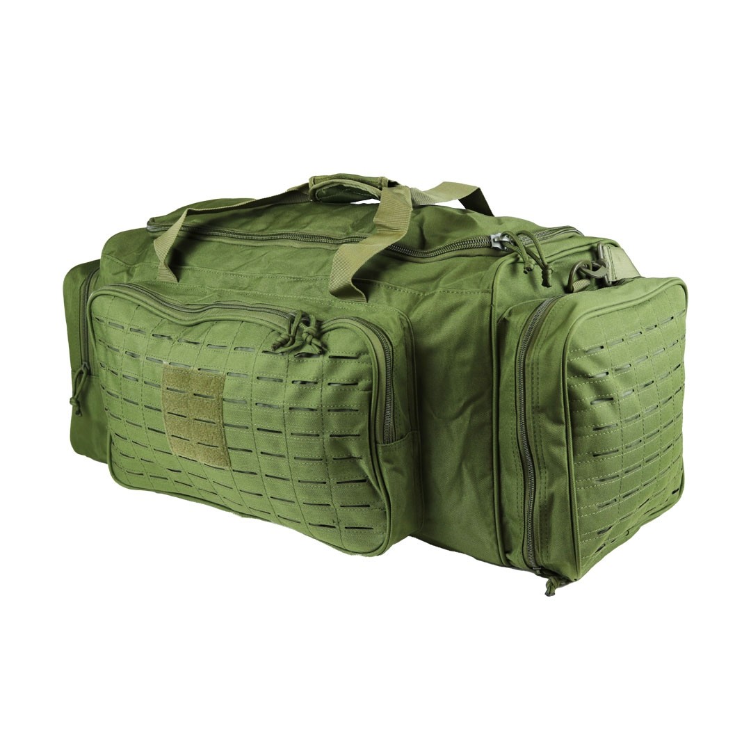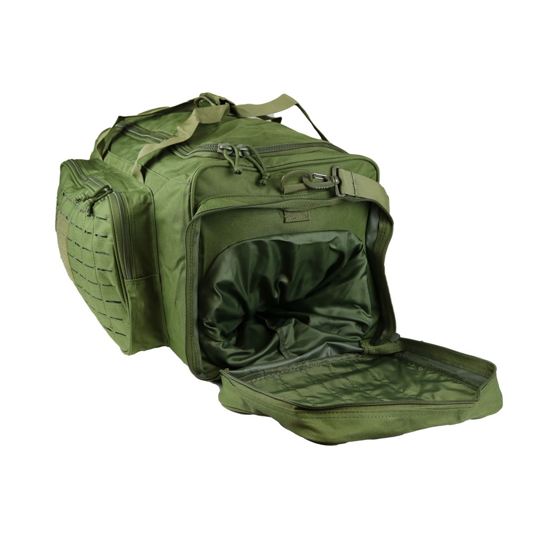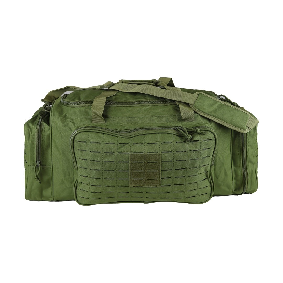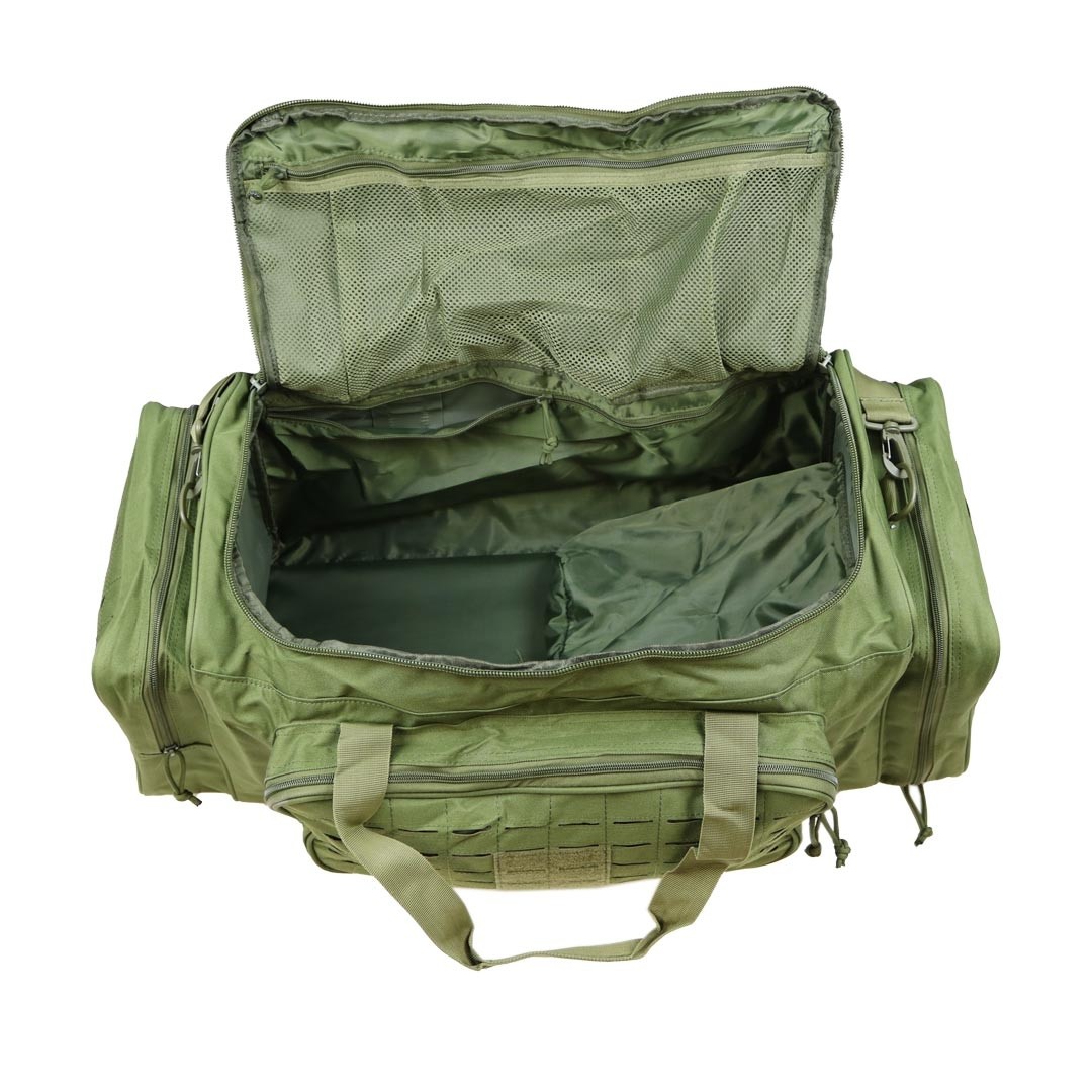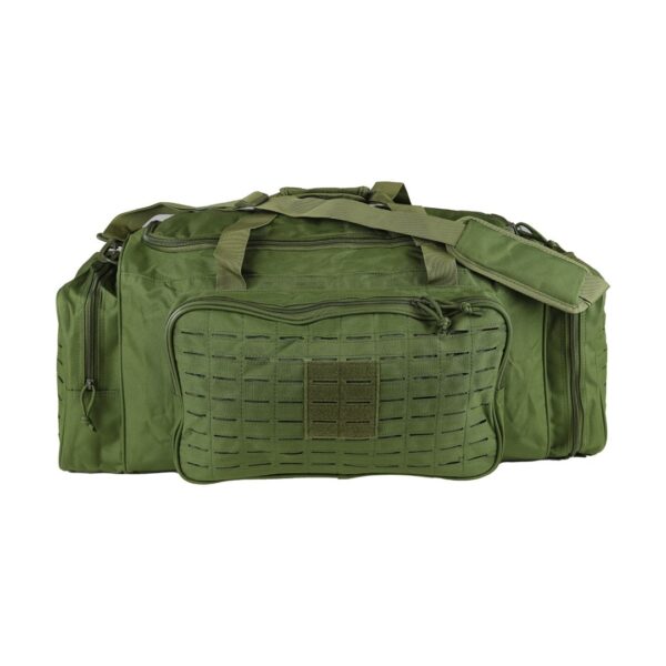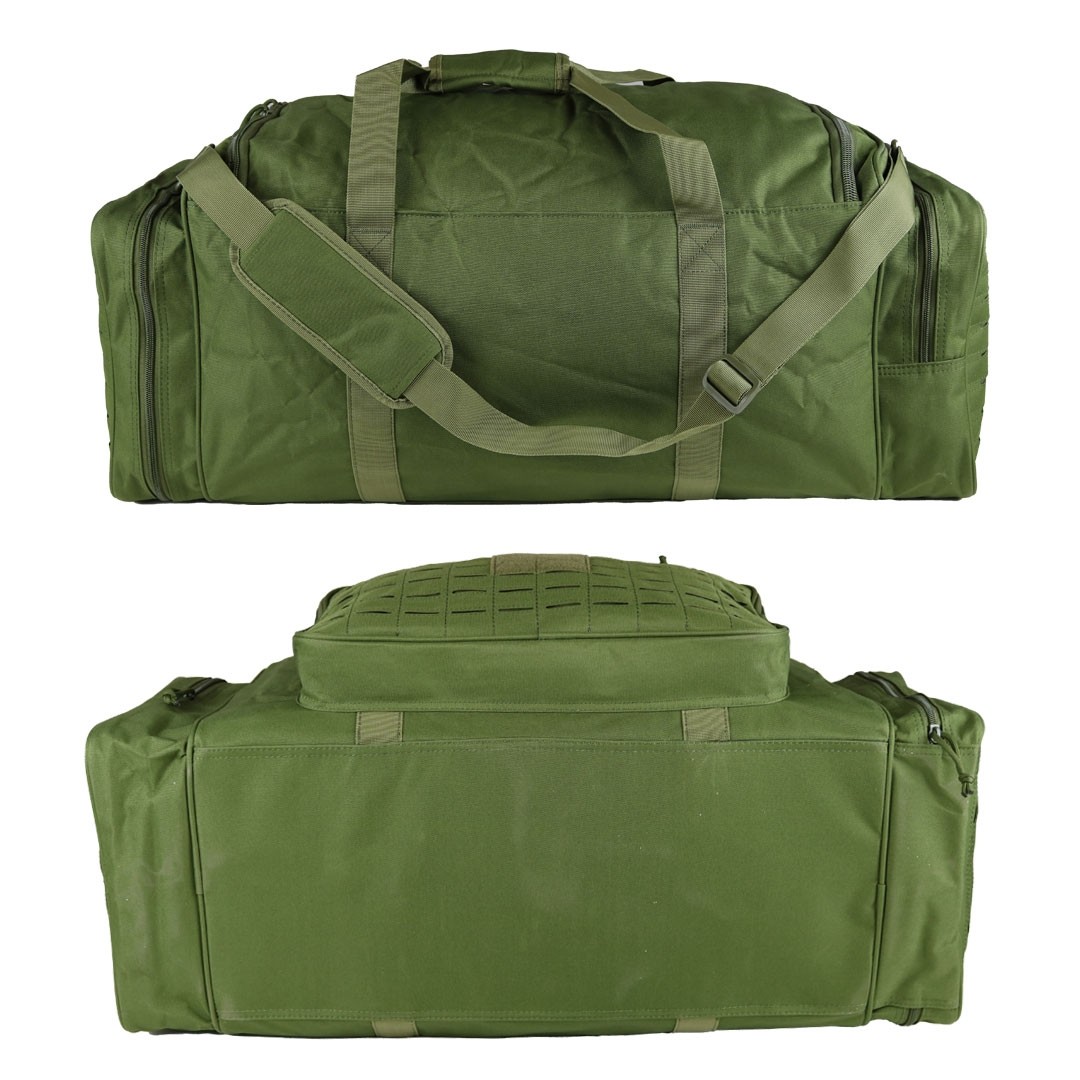 Sac de transport de couleur vert olive pour tous vos déplacements. Il possède une poche latérale pour y ranger des chaussures, ce qui évite de salir les autres affaires du sac. Il est équipé de nombreux passants MOLLE sur les poches latérales et fron