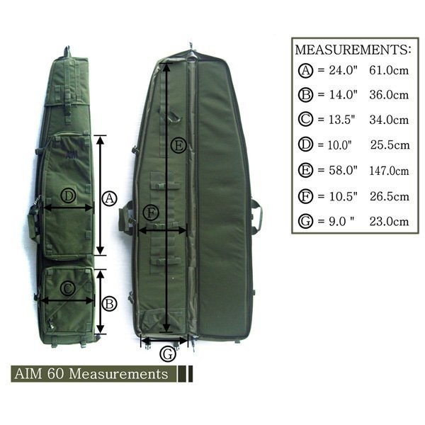 Sac à dos tactique AIM 60 pour l’emport d’une arme longue de type fusil de précision jusqu’à une longueur maximale de 59″ (149.5 cm). Exceptionnellement robuste, le Tactical DragBag est en Cordura® 1000 deniers avec un rembourrage en mousse très épais. Il se compose d’un compartiment principal et de 2 grandes poches extérieures pour les accessoires supplémentaires. Pour fusil de précision longue distance canon 22″ et plus, tireur d’élite longue distance, police, militaire et tireur sportif F Class.