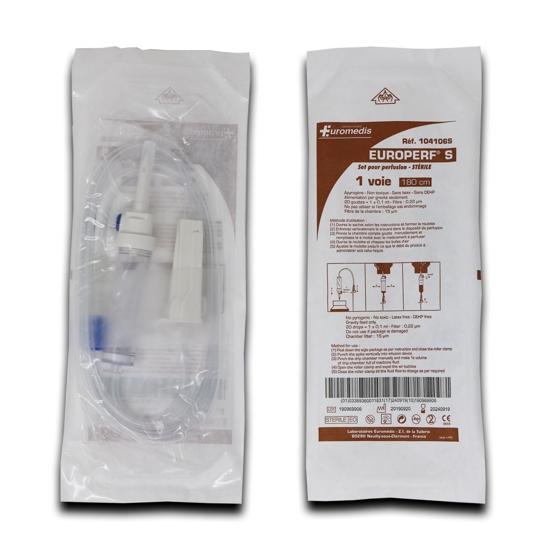 Tubulure à perfusion Europerf® S 180 cm Euromedis — Optez pour la qualité avec le perfuseur EUROPERF® stérile avec une prise d’air obturable, à membrane et avec un filtre bactériologique. Le perfuseur par gravité 1 voie EUROPERF® S est utilisé en perfusion intraveineuse, pour administrer par voie parentérale de médicaments, solutés… Ce dispositif méd.