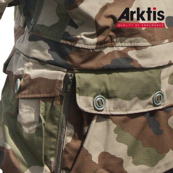 Filet de camouflage facial intégré à la capuche 4 poches cargo basses 2 poches poitrine à soufflet avec patte de protection 2 poches de poitrine plaquées et zippées pour documents 2 poches internes zippées 2 poches inférieures à soufflet 1 grande poche arrière à soufflet fermée par bouton canadien et zippée 1 poche stylos avec deux goussets sur les bras Ouvertures sous les bras, avec fermetures à glissière double curseur Rabat tempête et coudes renforcés Poignets réglables par bouton 3 systèmes de serrage équipés de serres blocs : à la capuche, à la taille et au bas de la veste. Patte porte gr