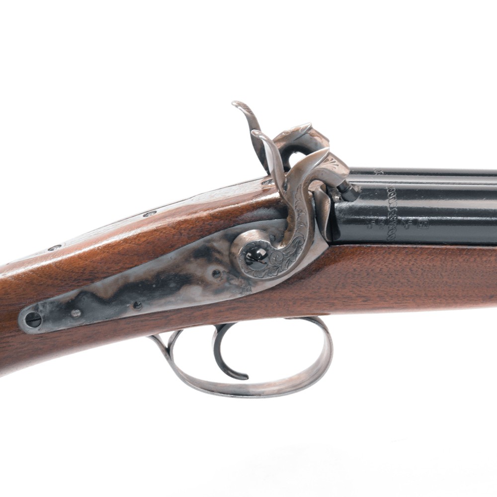 Fusil Baker Cavalry Pedersoli SxS cal. 20 percussion. Double canon juxtaposé, noyer sculpté, finition militaire. Collection et tir historique napoléonien.