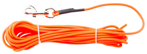 Enrobage en synthétique orange fluo. Âme en drisse nylon tressé noyé dans la masse de l'enrobage. Mousqueton chromé à une extrémité, l'autre extrémité libre.