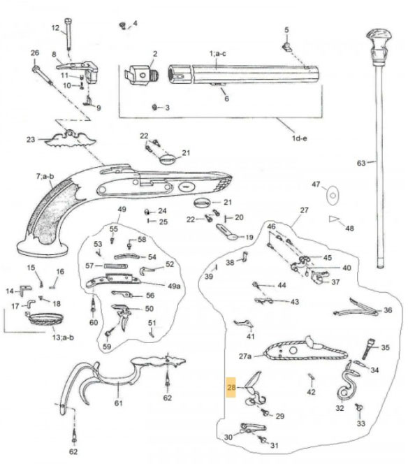 Retrouvez diverses pièces détachées pour fusil Lepage. Pièce d’origine Davide PEDERSOLI & C, elle s’intègre parfaitement dans l’assemblage d’origine de votre arme. Nous recommandons de faire appel à un armurier qualifié pour le montage si vous n’êtes pas familier avec le démontage de votre arme. L’utilisation de pièces d’origine est la garantie d’un fonctionnement sûr et conforme aux normes de sécurité en vigueur.