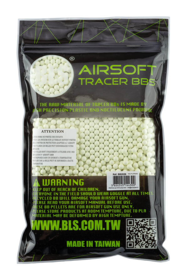 Sachet 1 kg billes airsoft tracer vertes BIO 0,25 g BLS – 6 mm. Luminescentes, biodégradables. Idéales pour les parties nocturnes et le réglage hop-up.