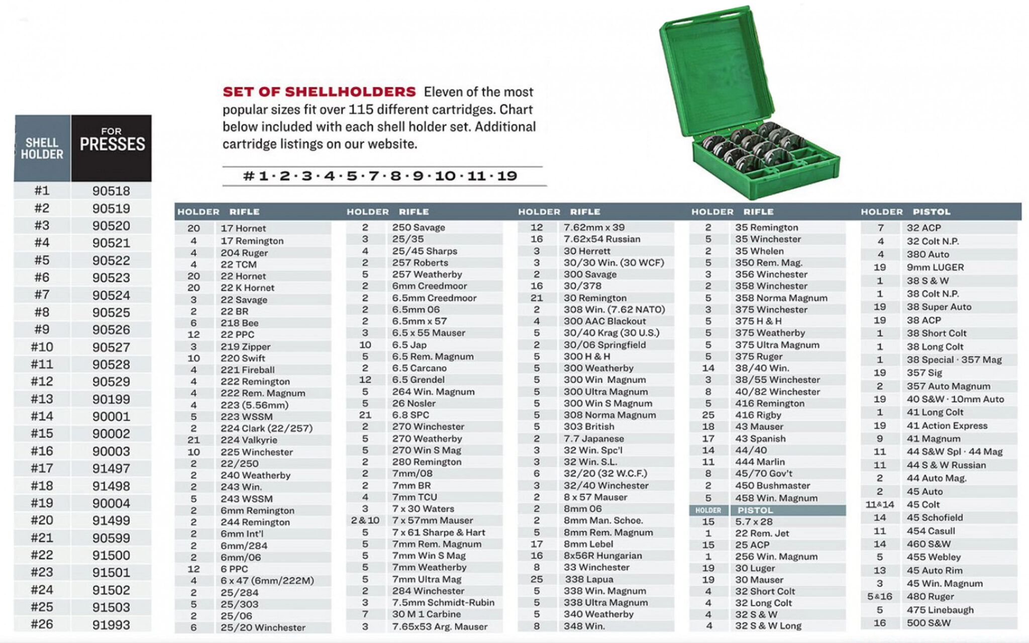 Calibre .22 Hornet / .223 (5.56 mm) / .25 ACP / .30 M1 / .30-30 Win / .303 British / .32-20 / .338 Lapua Mag / .357 Mag / .38 ACP / .43 Mauser / .45 Auto (ACP) / .45 Auto Rim / .45 Colt / .45-70 Government / .45-75 Winchester / .460 S&W / .500 S&W / .577 Snider / 7.62 x 39 / 8 mm Lebel